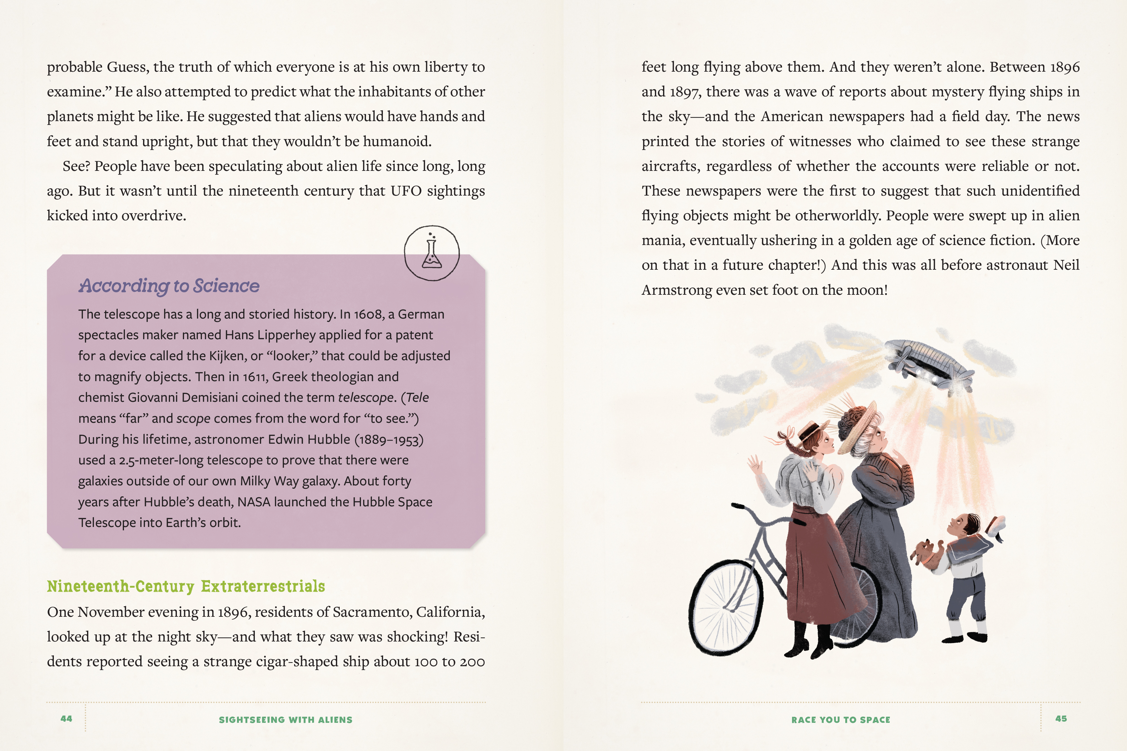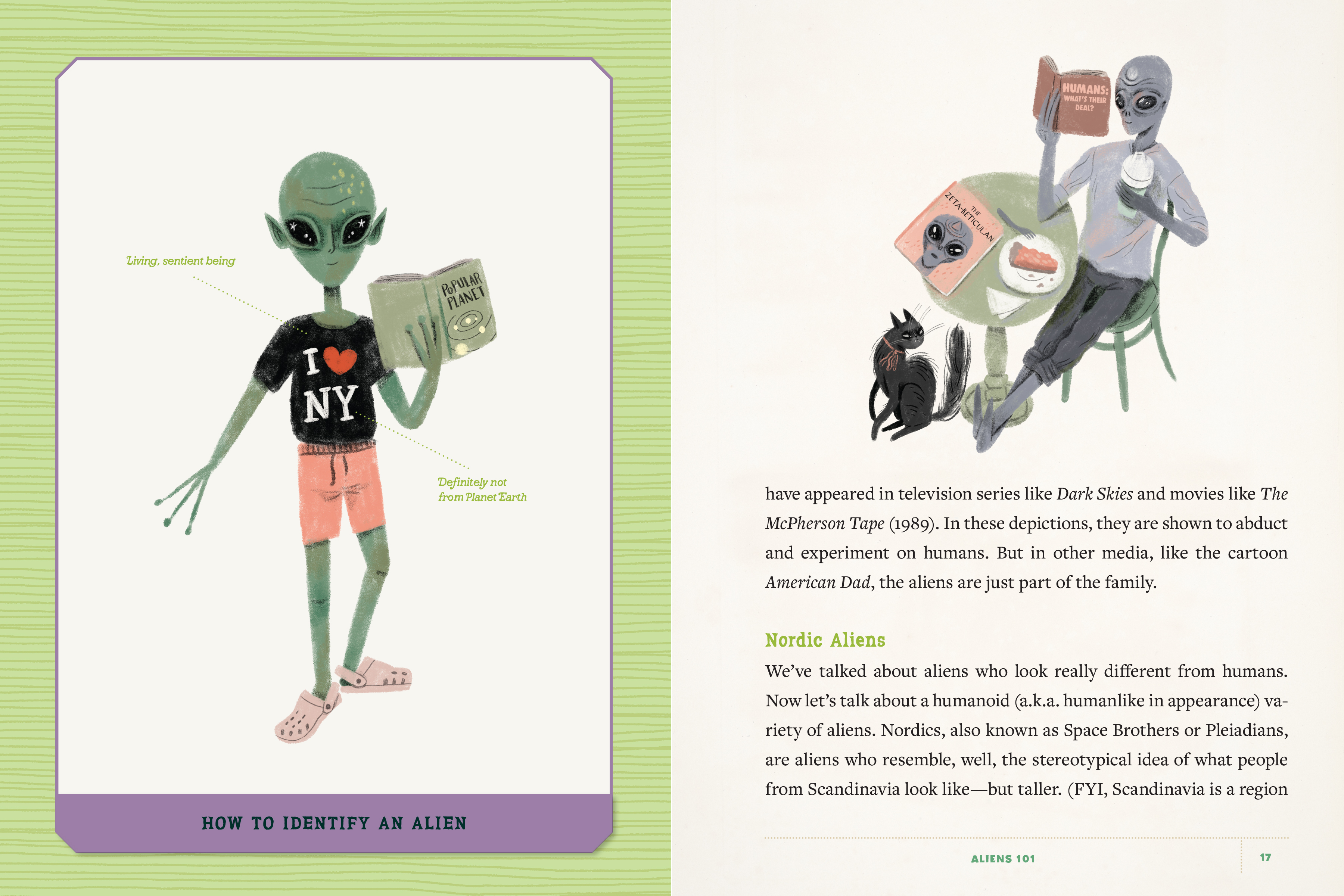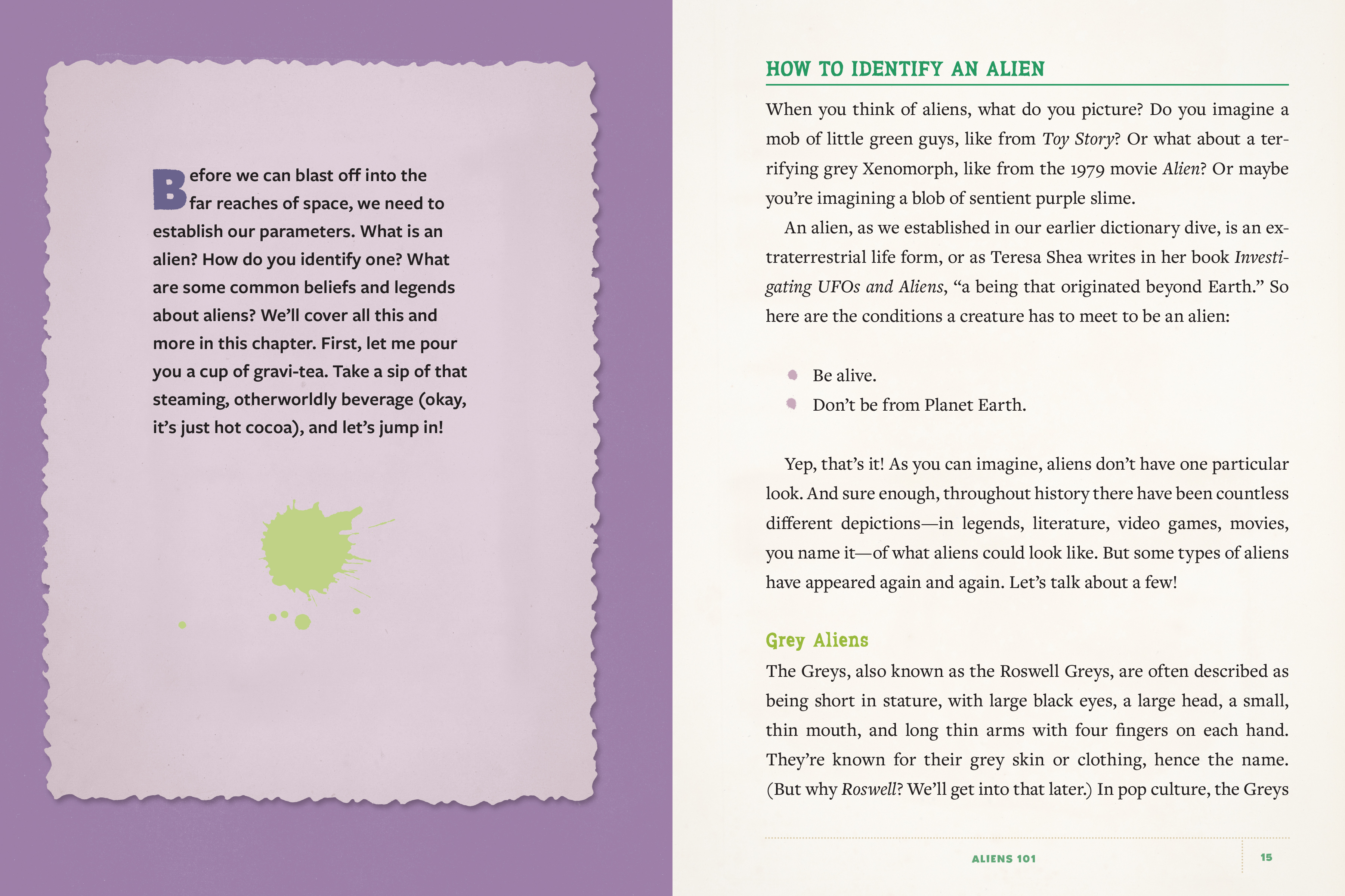 Allow me to introduce myself. I am your 100 percent human, totally-not-an-alien guide to the mysteries and wonders of the supernatural, paranormal, and extraterrestrial. In this book, we’re blasting off to the cosmos! You guessed it—we’ll be gathering data on aliens. Together, you and I will rocket through science, discover spacefaring history, meet up with fictional alien friends, and more!