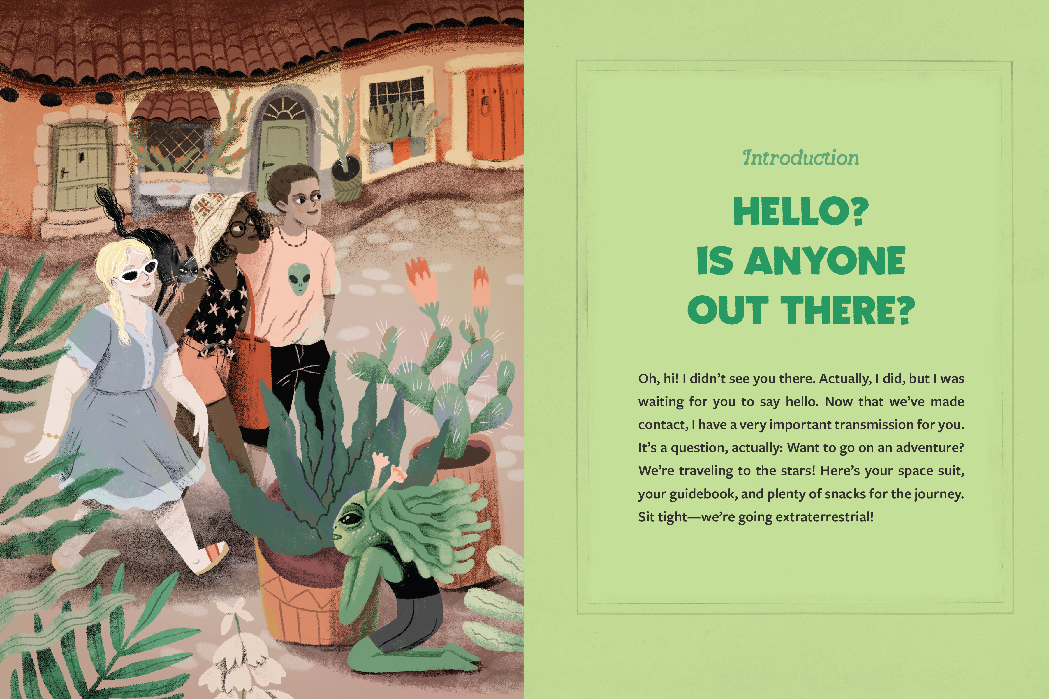 Oh, hi! I didn’t see you there. Actually, I did, but I was waiting for you to say hello. Now that we’ve made contact, I have a very important transmission for you. It’s a question, actually: Want to go on an adventure? We’re traveling to the stars! Here’s your space suit, your guidebook, and plenty of snacks for the journey. Sit tight—we’re going extraterrestrial!